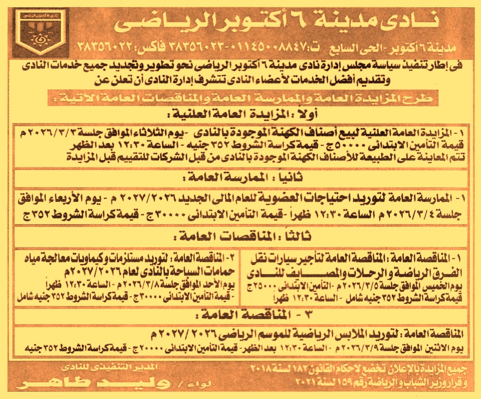 HOT Information ممارسة عامة لعملية توريد احتياجات العضوية للعام المالي الجديد 2026/2027 عن جريدة الجمهورية Post navigation هيئة المواد النووية شركة الأسكندرية للحراريات