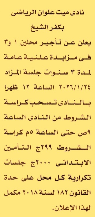 HOT Information مزايدة علنية عامة لعملية تأجير محلين 1 و3 لمدة 3 سنوات (تعاد الجلسة أسبوعيا حتى إتمام الرسو) عن جريدة الأخبار Post navigation مستشفيات جامعة المنيا الإدارة العامة لصرف جنوب المنيا