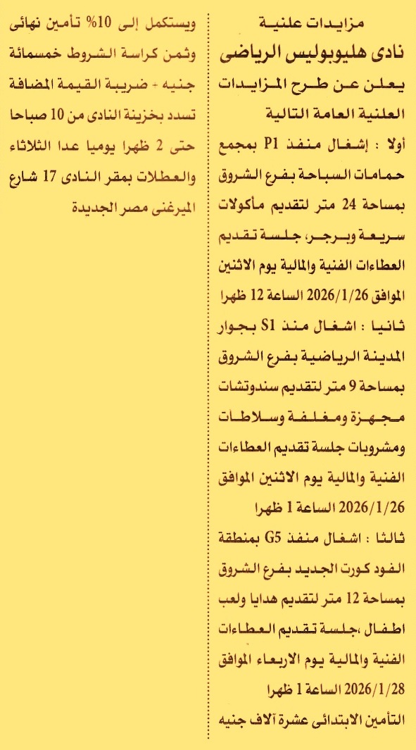 HOT Information مزايدة علنية عامة لعملية إشغال منفذ P1 بمجمع حمامات السباحة بفرع الشروق بمساحة 24م لتقديم مأكولات سريعة وبرجر (تسحب الكراسات من الساعة 10 ص حتى 2 ظ يوميا عدا الثلاثاء) عن جريدة الأهرام Post navigation مديرية المساحة بدمنهور مركز التنمية الشبابية بالمنشية