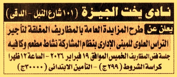 HOT Information مزايدة عامة لعملية تأجير التراس العلوي للمبنى الإداري بنظام المشاركة بنشاط مطعم وكافيه عن جريدة الجمهورية Post navigation الجامعة المصرية اليابانية للعلوم والتكنولوجيا ببرج العرب نادي كفر الزيات الرياضي