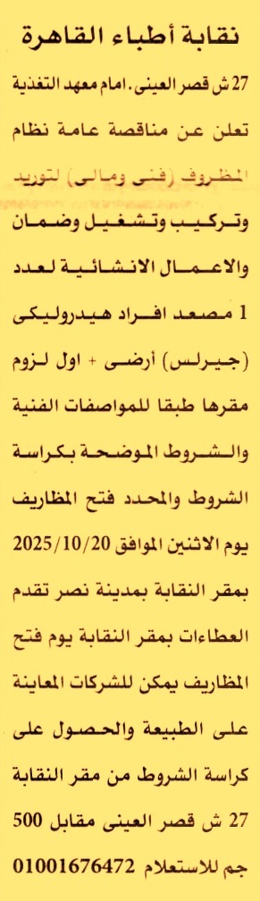 HOT Information مناقصة عامة لعملية توريد وتركيب وتشغيل وضمان والأعمال الإنشائية لعدد 1 مصعد أفراد هيدروليكي “جيرلس” أرضي وأول لزوم مقر النقابة عن جريدة الأهرام Post navigation الإدارة العامة لري بني سويف الهيئة العامة لموانئ البحر الأحمر