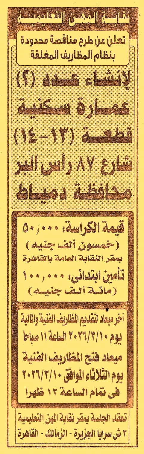 إنشاء عدد 2 عمارة سكنية قطعة 13, 14 شارع 87 رأس البر – محافظة دمياط