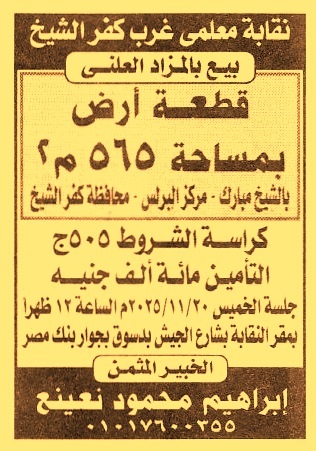 HOT Information مزايدة علنية لعملية بيع قطعة أرض بمساحة 565م2 بالشيخ مبارك – مركز البرلس – محافظة كفر الشيخ عن جريدة الأخبار Post navigation شركة الغازات البترولية وزارة الصحة والسكان