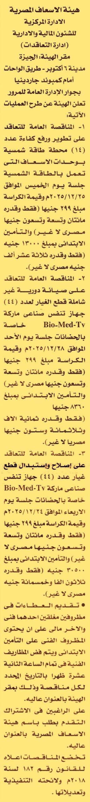 HOT Information مناقصة عامة لعملية تطوير ورفع كفاءة عدد 14 محطة طاقة شمسية بوحدات الإسعاف التي تعمل بالطاقة الشمسية عن جريدة الأخبار Post navigation وزارة الصحة والسكان الهيئة العامة للرعاية الصحية ببورسعيد