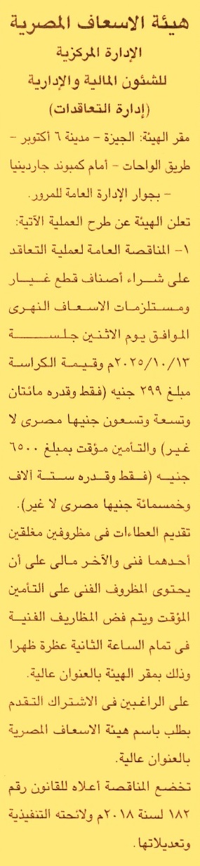 HOT information مناقصة عامة لعملية توريد أصناف قطع غيار ومستلزمات الإسعاف النهري عن جريدة الجمهورية Post navigation محافظة شمال سيناء الهيئة العامة لميناء الإسكندرية