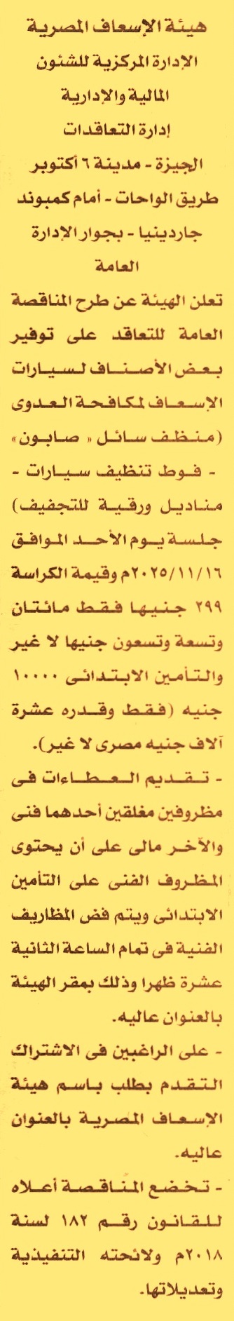 HOT Information مناقصة عامة لعملية توريد بعض الأصناف لسيارات الإسعاف لمكافحة العدوي “منظف سائل “صابون” – فوط تنظيف سيارات – مناديل ورقية للتجفيف” عن جريدة الأخبار Post navigation مديرية الشئون الصحية بالقليوبية محافظة الفيوم