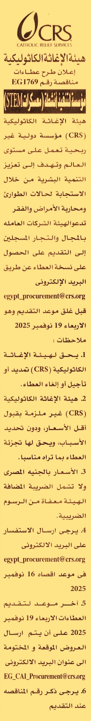 (تطلب الكراسات وتقدم العروض عن طريق البريد الإلكتروني قبل موعد غلق التقديم يوم 19/11/2025