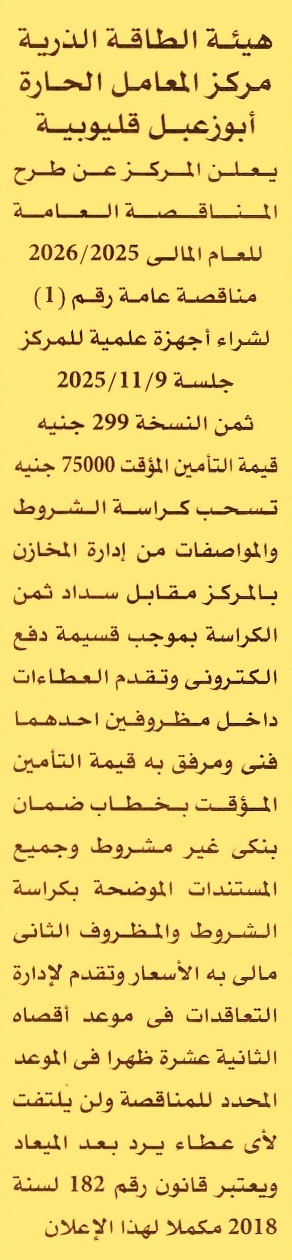 HOT Information مناقصة عامة رقم 1/2025/2026 لعملية توريد أجهزة علمية للمركز عن جريدة الأهرام Post navigation رئاسة مركز ومدينة المحلة الكبرى الشركة المصرية لإدارة وتشغيل المترو