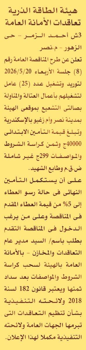 HOT Information مناقصة عامة رقم 8/2025/2026 لعملية توريد وتشغيل عدد 25 عامل لتشغيلهم بأعمال العتالة والمناولة بصالتي التشعيع بموقعي الهيئة بمدينة نصر وأم زغيو بالإسكندرية عن جريدة الأهرام Post navigation جامعة أسيوط الأهلية مديرية الشئون الصحية بالشرقية