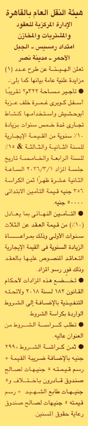 HOT information مزايدة عامة لعملية تأجير مساحة 322م2 تقريبا أسفل كوبري غمرة خلف عزبة أبو حشيش واستخدامها كنشاط تجاري لمدة 5 سنوات بزيادة 10% سنويا عن جريدة الجمهورية Post navigation المستشفى الجامعي بالإسماعيلية مستشفى معهد الكبد القومي