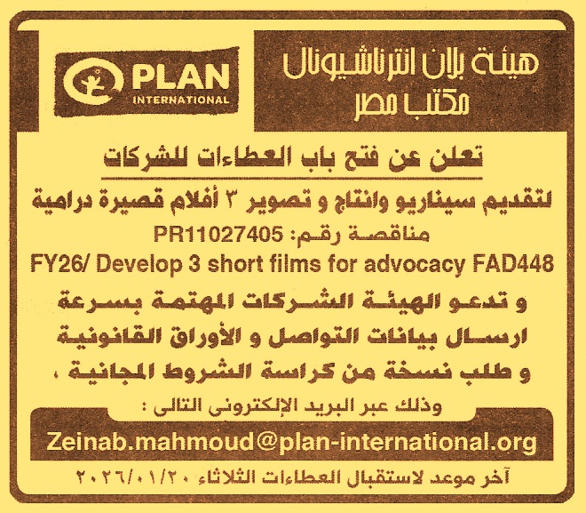 HOT Information مناقصة عامة رقم PR11027405 لعملية تقديم سيناريو وإنتاج وتصوير 3 أفلام قصيرة درامية (أخر موعد لتقديم العطاءات يوم 20/1/2026) عن جريدة الأهرام Post navigation جهاز تنمية مدينة أسيوط الجديدة جامعة العاصمة