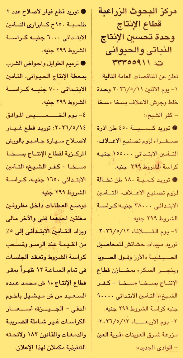 HOT information مناقصة عامة لعملية توريد الأتي (1) كمية 450 طن أذرة صفراء لزوم تصنيع الأعلاف (2) كمية 180 طن نخالة لزوم تصنيع الأعلاف لوحدة خلط وجرش الأعلاف بسخا “سخا – كفر الشيخ” عن جريدة الجمهورية Post navigation الشركة المصرية للأتوبيس الترددي جامعة طنطا