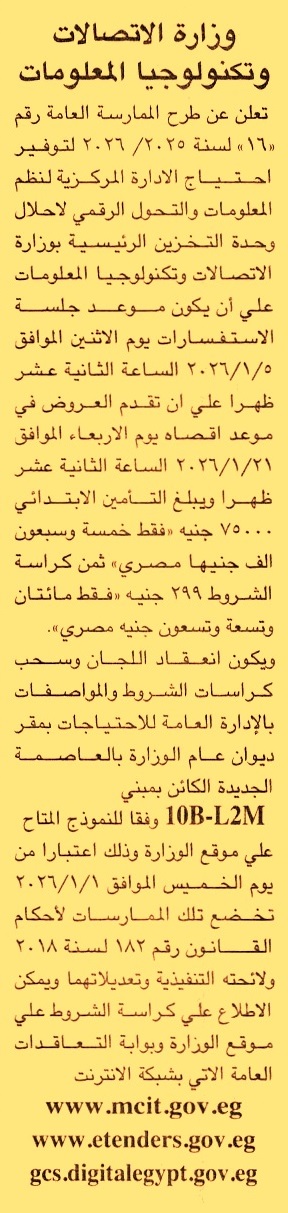 HOT Information ممارسة عامة رقم 16/2025/2026 لعملية توريد احتياج الإدارة المركزية لنظم المعلومات والتحول الرقمي لإحلال وحدة التخزين الرئيسية بالوزارة (جلسة الاستفسارات يوم 5/1/2026) عن جريدة الجمهورية Post navigation الجمعية التعاونية المركزية بدمياط نادي رشيد الرياضي