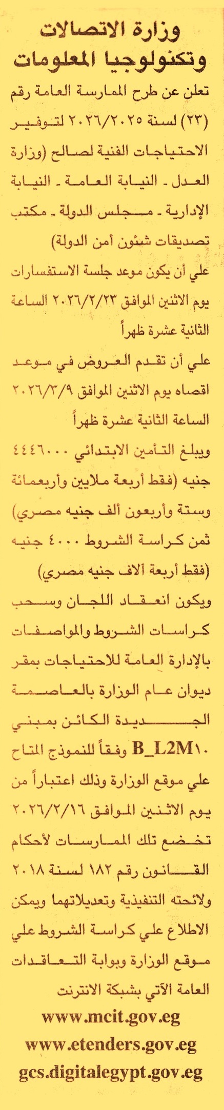 توريد الاحتياجات الفنية لصالح “وزارة العدل – النيابة العامة – النيابة الإدارية – مجلس الدولة – مكتب تصديقات شئون أمن الدولة”