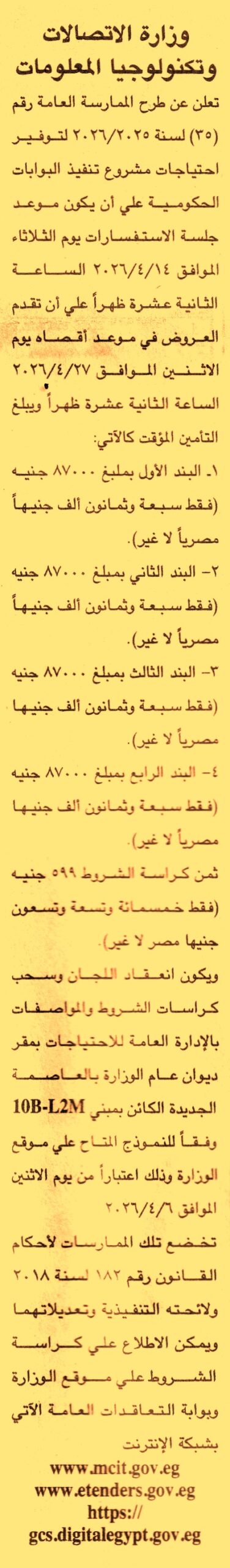 HOT Information ممارسة عامة رقم 35/2025/2026 لعملية توريد احتياجات مشروع تنفيذ البوابات الحكومية (1) البند الأول (2) البند الثاني (3) البند الثالث (4) البند الرابع (جلسة الاستفسارات يوم 14/4/2026) عن جريدة الجمهورية Post navigation الهيئة العامة للمنطقة الاقتصادية لقناة السويس الشركة المصرية لتجارة الجملة
