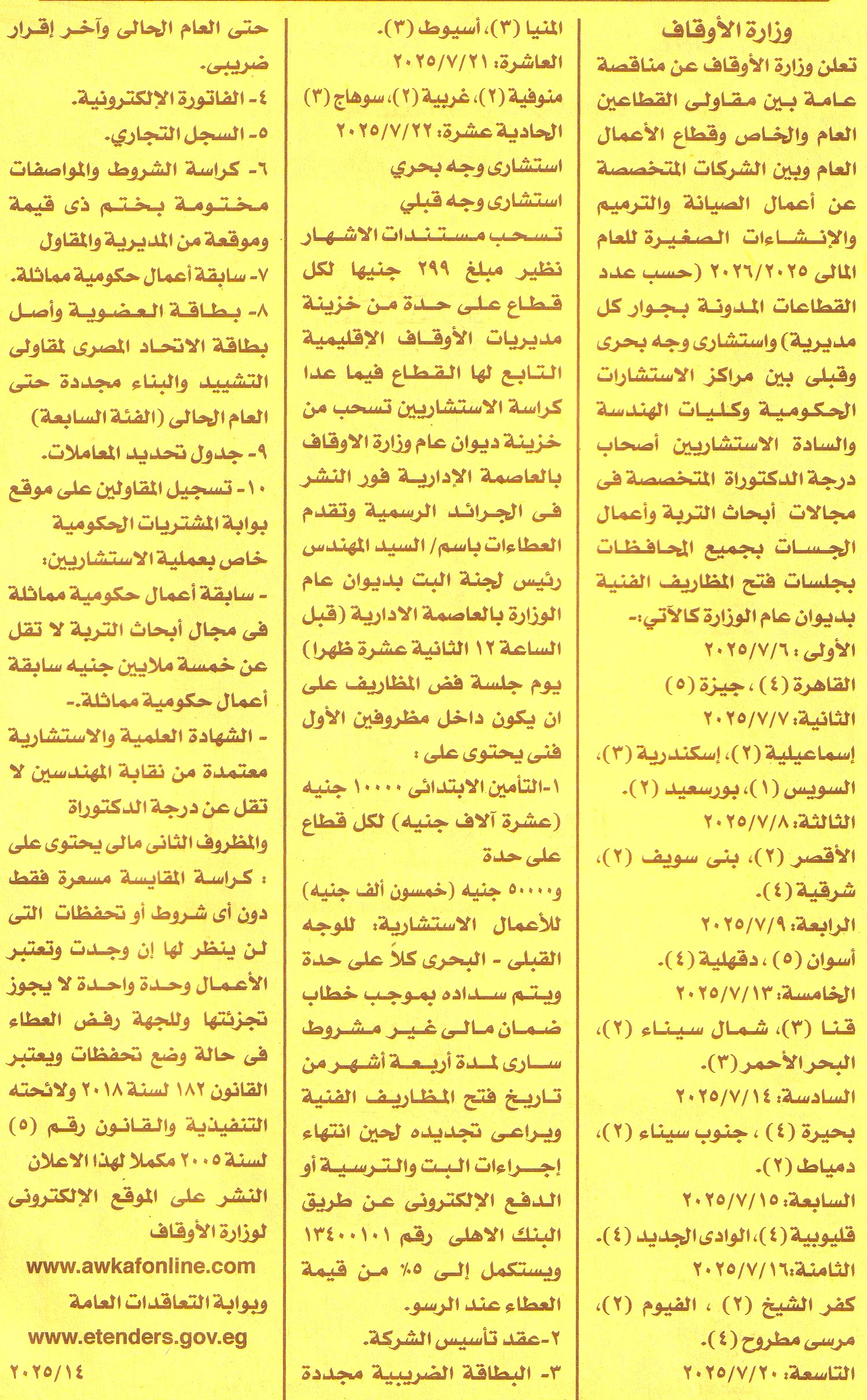 اعمال الصيانة والترميم والانشاءات الصغيرة  للعام المالي 2025/2026 حسب عدد القطاعات المدونة بجوار كل مديرية بين الشركات المتخصصة واستشاري وجه بحري وقبلي بين مراكر الاستشارات الحكومية وكليات الهندسة والسادة الاستشاريين اصحاب درجة الدكتوراه  المتخصصة في مجالات أبحاث التربة وأعمال الجسات لكل العمليات بجميع المحافظات كالآتي: