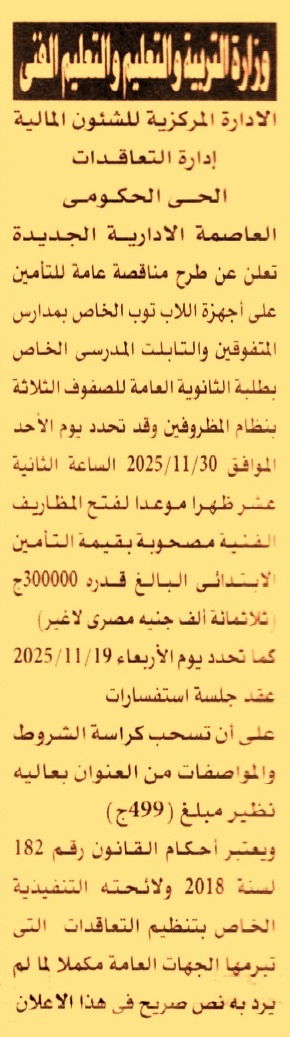 HOT Information مناقصة عامة لعملية التأمين على أجهزة اللاب توب الخاص بمدارس المتفوقين والتابلت المدرسي الخاص بطلبة الثانوية العامة للصفوف الثلاثة (جلسة الاستفسارات يوم 19/11/2025) عن جريدة الأهرام Post navigation محافظة الإسماعيلية الهيئة العامة للرقابة المالية