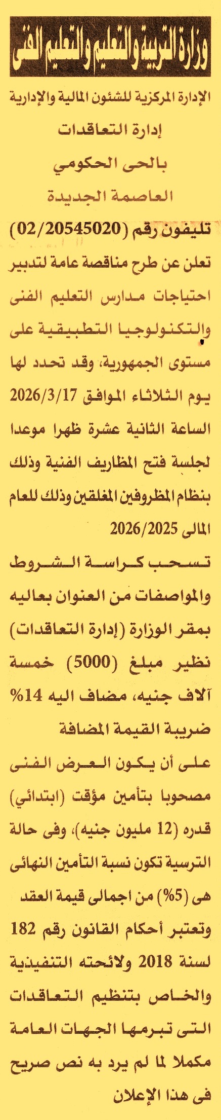 توريد احتياجات مدارس التعليم الفني والتكنولوجيا التطبيقية على مستوى الجمهورية