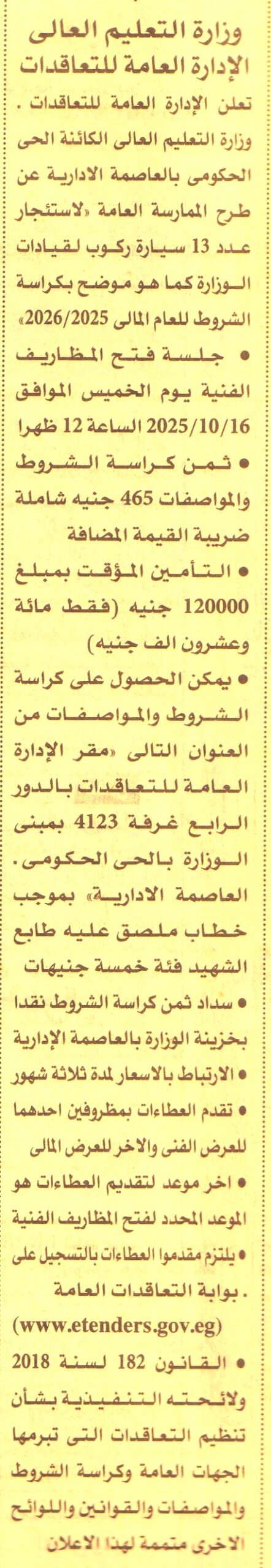 تأجير عدد 13 سيارة ركوب لقيادات الوزارة