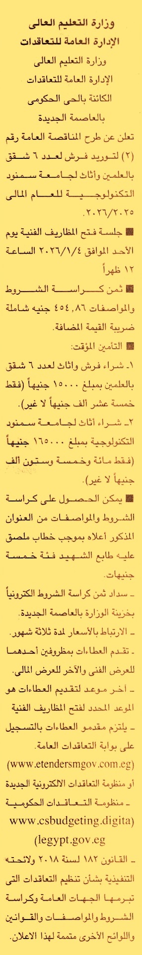 HOT Information مناقصة عامة رقم 2/2025/2026 لعملية توريد فرش لعدد 6 شقق بالعلمين وأثاث لجامعة سمنود التكنولوجية (1) توريد فرش وأثاث لعدد 6 شقق بالعلمين (2) توريد أثاث لجامعة سمنود التكنولوجية (مدة الارتباط بالأسعار 3 أشهر) عن جريدة الجمهورية Post navigation جمعية الحياة للتكافل الاجتماعي والخدمات بدمياط وزارة التربية والتعليم والتعليم الفني