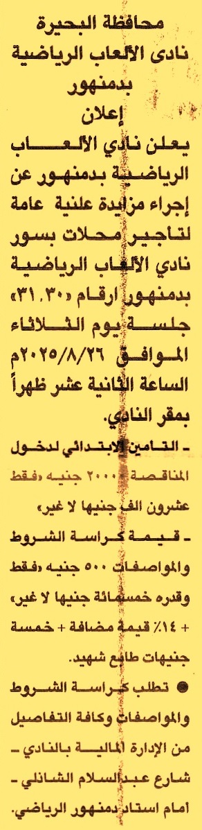 HOT Information مزايدة علنية عامة لعملية تأجير محلات بسور النادي أرقام “30, 31” عن جريدة الجمهورية Post navigation نادي الألعاب الرياضية بدمنهور وزارة التنمية المحلية