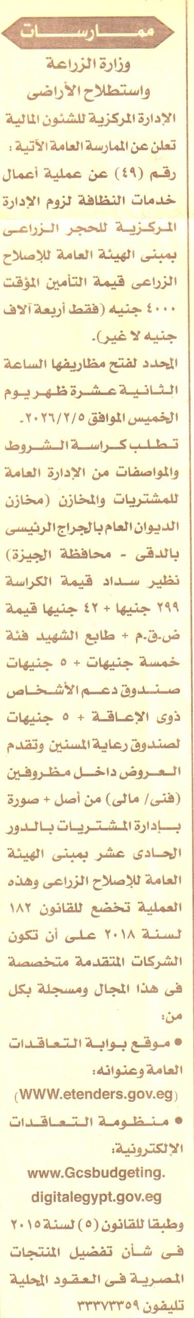 HOT information ممارسة عامة رقم 49 لعملية أعمال خدمات النظافة لزوم الإدارة المركزية للحجر الزراعي بمبنى الهيئة العامة للإصلاح الزراعي عن جريدة الأخبار Post navigation الخبير العقاري أشرف محمد هيبة محافظة الدقهلية رئاسة حي غرب المنصورة