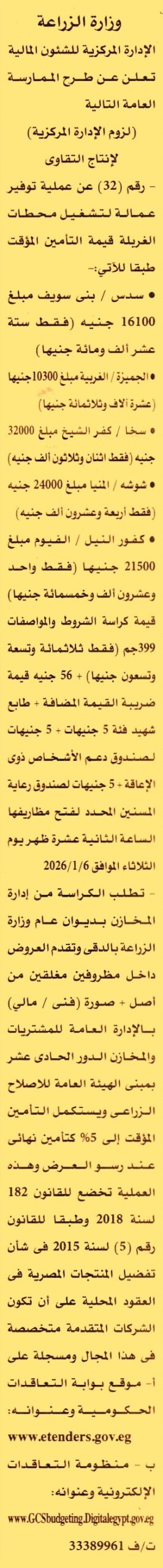 HOT Information ممارسة عامة رقم 32 لعملية توفير عمالة لتشغيل محطات الغربلة (1) سدس/ بني سويف (2) الجميزة/ الغربية (3) سخا/ كفر الشيخ (4) شوشة/ المنيا (5) كفور النيل/ الفيوم (تقدم العطاءات من أصل وصورة) عن جريدة الأهرام Post navigation محافظة المنيا الجمعية التعاونية العامة للإصلاح الزراعي
