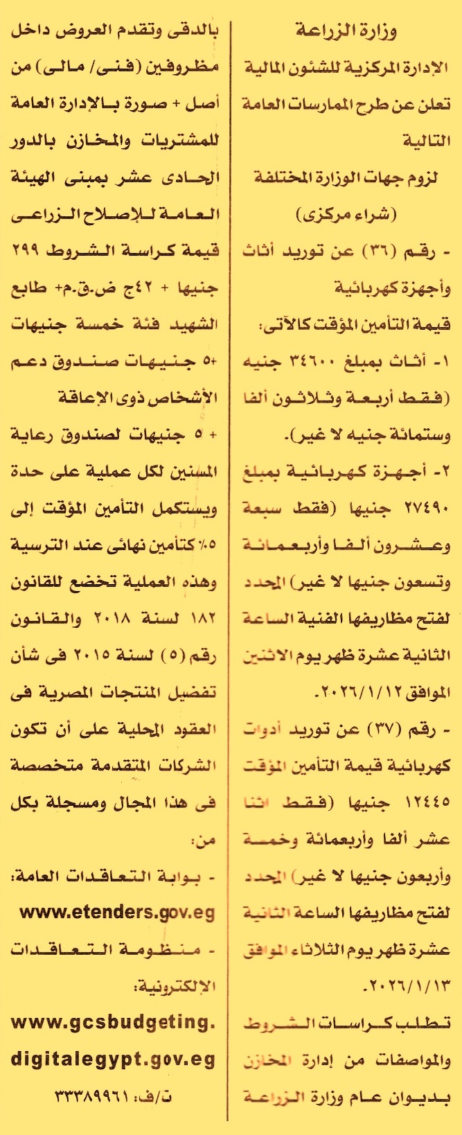 HOT Information ممارسة عامة رقم 36 لعملية توريد أثاث وأجهزة كهربائية (1) أثاث (2) أجهزة كهربائية لزوم جهات الوزارة المختلفة “شراء مركزي” (تقدم العطاءات من أصل وصورة) عن جريدة الأخبار Post navigation شركة مصر للبترول وزارة الزراعة واستصلاح الأراضي