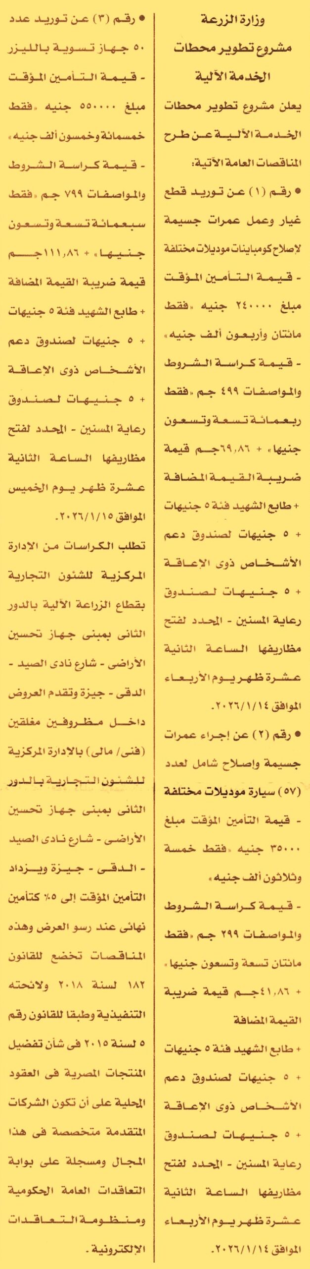 HOT Information مناقصة عامة رقم 1 لعملية توريد قطع غيار وعمل عمرات جسيمة إصلاح كومباينات موديلات مختلفة عن جريدة الأخبار Post navigation محافظة مطروح مكتبة الإسكندرية