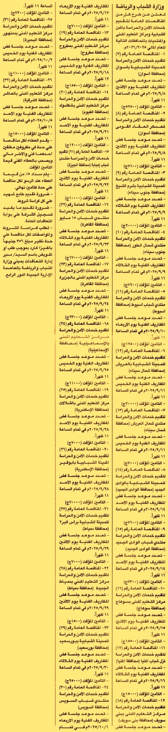 HOT information مناقصة عامة رقم 7/2025/2026 لعملية تقديم خدمات الأمن والحراسة للمدينة الشبابية بأسوان بمحافظة أسوان عن جريدة الجمهورية Post navigation مركز شباب الكوم الأحمر مدارس المنيل القومية