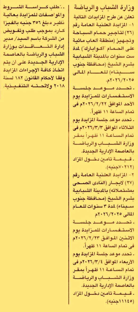 HOT Information مزايدة علنية عامة رقم 26 لعملية تأجير حمام السباحة وتجهيز منطقة ألعاب مائية على الحمام “أكوا بارك” لمدة 6 سنوات بالمدينة الشبابية بشرم الشيخ (جلسة الاستفسارات يوم 22/2/2026 الساعة 11 ظ) عن جريدة الجمهورية Post navigation جمعية بيتي لتنمية المجتمع والإعاقة بأسيوط محافظة دمياط