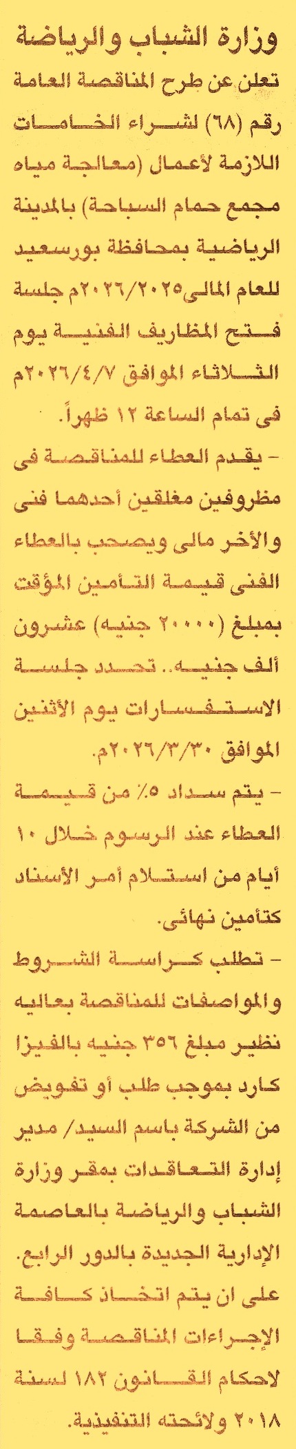 توريد الخامات اللازمة لأعمال “معالجة مياه مجمع حمام السباحة” بالمدينة الرياضية بمحافظة بورسعيد