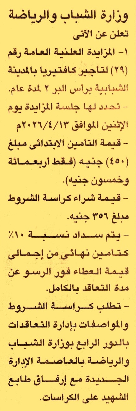 HOT Information مزايدة عامة رقم 29/2026 لعملية تأجير كافتيريا بالمدينة الشبابية برأس البر 2 لمدة عام عن جريدة الجمهورية Post navigation محافظة الدقهلية مستشفى جمعية جمال الدين الأفغاني