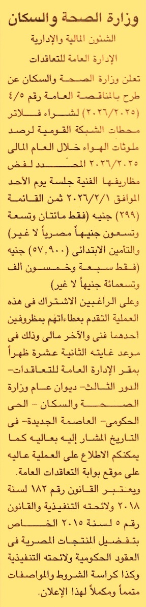 HOT information مناقصة عامة رقم 5/4/2025/2026 لعملية توريد فلاتر محطات الشبكة القومية لرصد ملوثات الهواء عن جريدة الجمهورية Post navigation محافظة الوادي الجديد جهاز تنمية مدينة القاهرة الجديدة