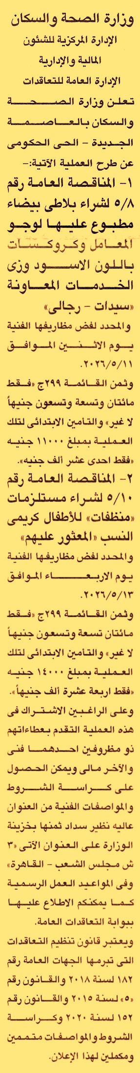 HOT information مناقصة عامة رقم 8/5 لعملية توريد بلاطي بيضاء مطبوع عليها لوجو المعامل وكروكسات باللون الأسود وزي الخدمات المعاونة “سيدات, رجالي” عن جريدة الجمهورية Post navigation نادي تليفونات بني سويف الجمعية التعاونية للبناء والإسكان لمستشاري هيئة قضايا الدولة بمدينة المنصورة