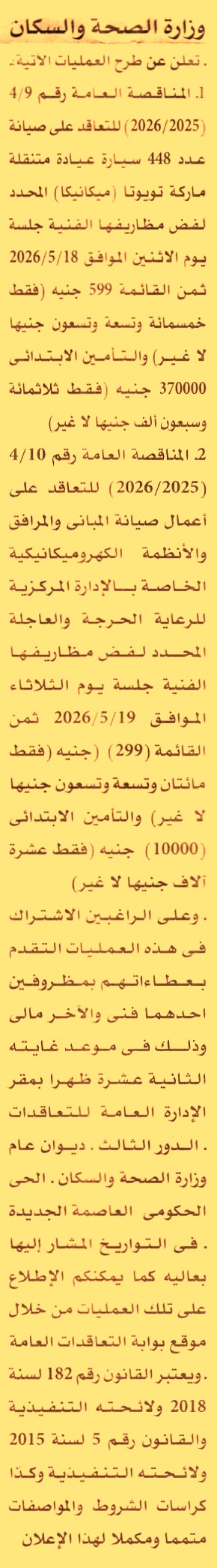 HOT Information مناقصة عامة رقم 9/4/2025/2026 لعملية صيانة عدد 448 سيارة عيادة متنقلة ماركة تويوتا “ميكانيكا” عن جريدة الأهرام Post navigation الهيئة القومية لسكك حديد مصر شركة جنوب القاهرة لتوزيع الكهرباء