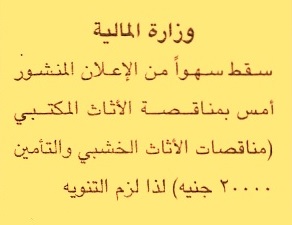HOT Information وزارة المالية سقط سهوا من الإعلان المنشور أمس بمناقصة الأثاث المكتبي “مناقصات الأثاث الخشبي” التأمين 20.000ج لذا لزم التنويه عن جريدة الجمهورية Post navigation الشركة الوطنية لخدمات الملاحة الجوية الهيئة العامة لشئون المطابع الأميرية