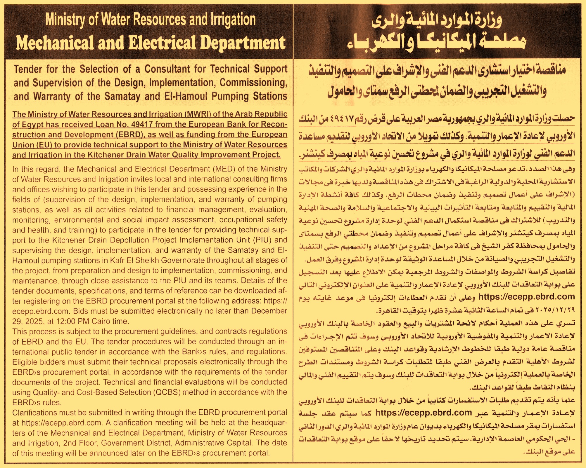 اختيار استشاري الدعم الفني والإشراف على التصميم والتنفيذ والتشغيل التجريبي والضمان لمحطتي الرفع سمتاي والحامول بمحافظة كفر الشيخ