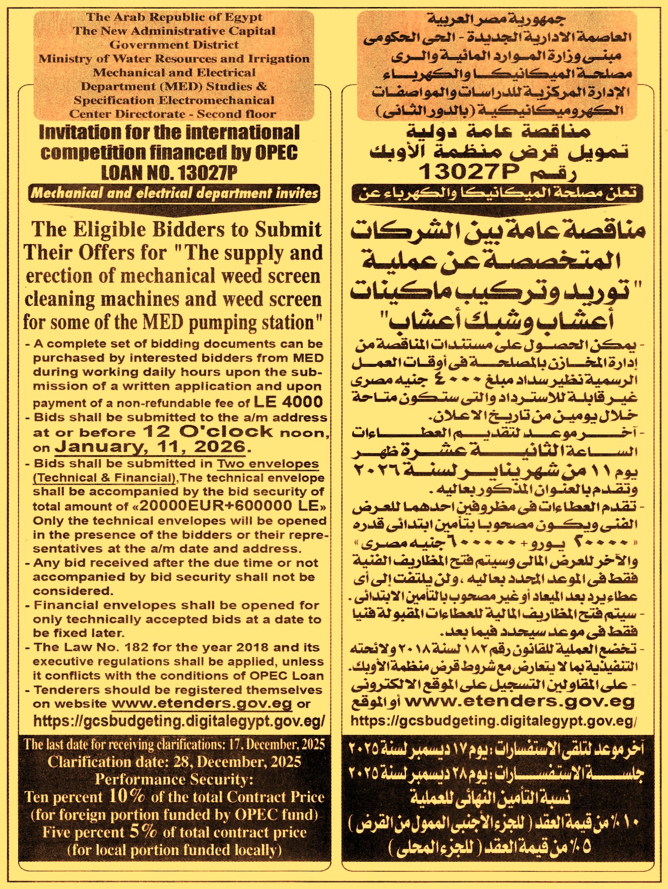 (أخر موعد لتقديم العطاءات يوم 11/1/2026