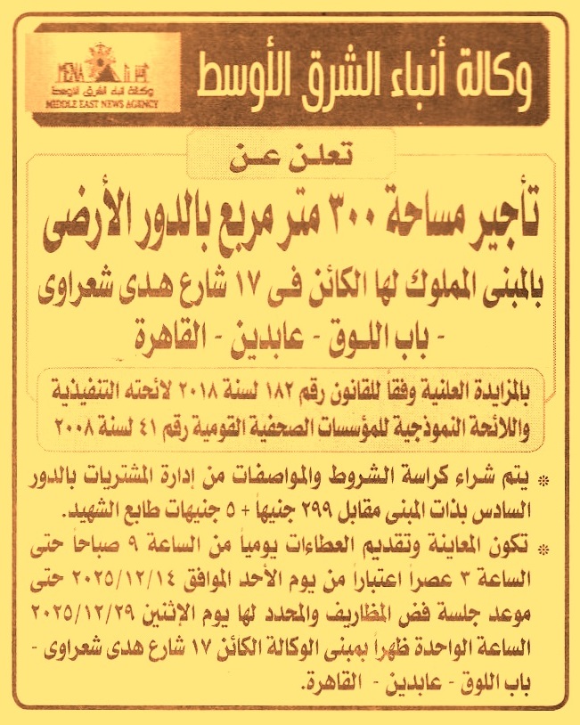 HOT information مزايدة علنية لعملية تأجير مساحة 300م2 بالدور الأرضي بمبنى الوكالة (المعاينة من الساعة 9 ص حتى 3 ع) عن جريدة الأخبار Post navigation جامعة القاهرة مديرية التربية والتعليم بالدقهلية