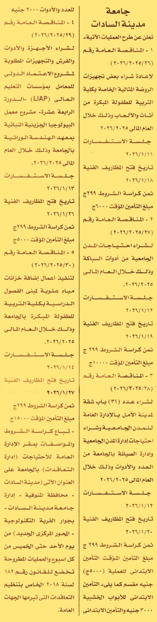 HOT Information مناقصة عامة رقم 26/2025/2026 لعملية إعادة توريد بعض تجهيزات الروضة المثالية الخاصة بكلية التربية للطفولة المبكرة من أثاث والألعاب (جلسة الاستفسارات يوم 11/1/2026) عن جريدة الأخبار Post navigation مصلحة الشهر العقاري والتوثيق مديرية الصحة بالقليوبية