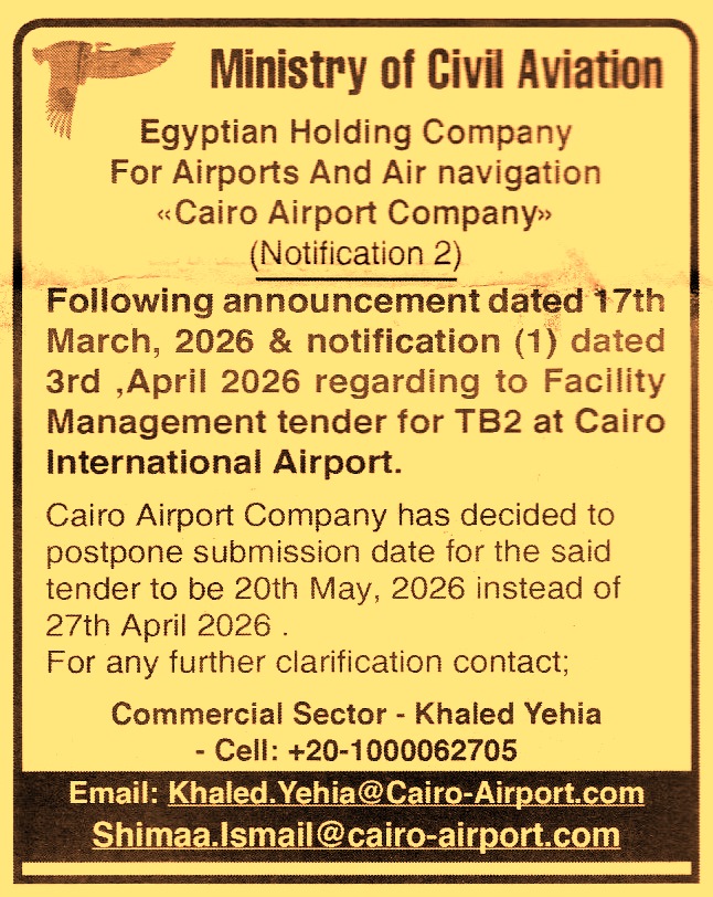 Cairo Airport Company has decided to postpone submission date for the said tender to be 20th May, 2026 instead of 27th April 2026.