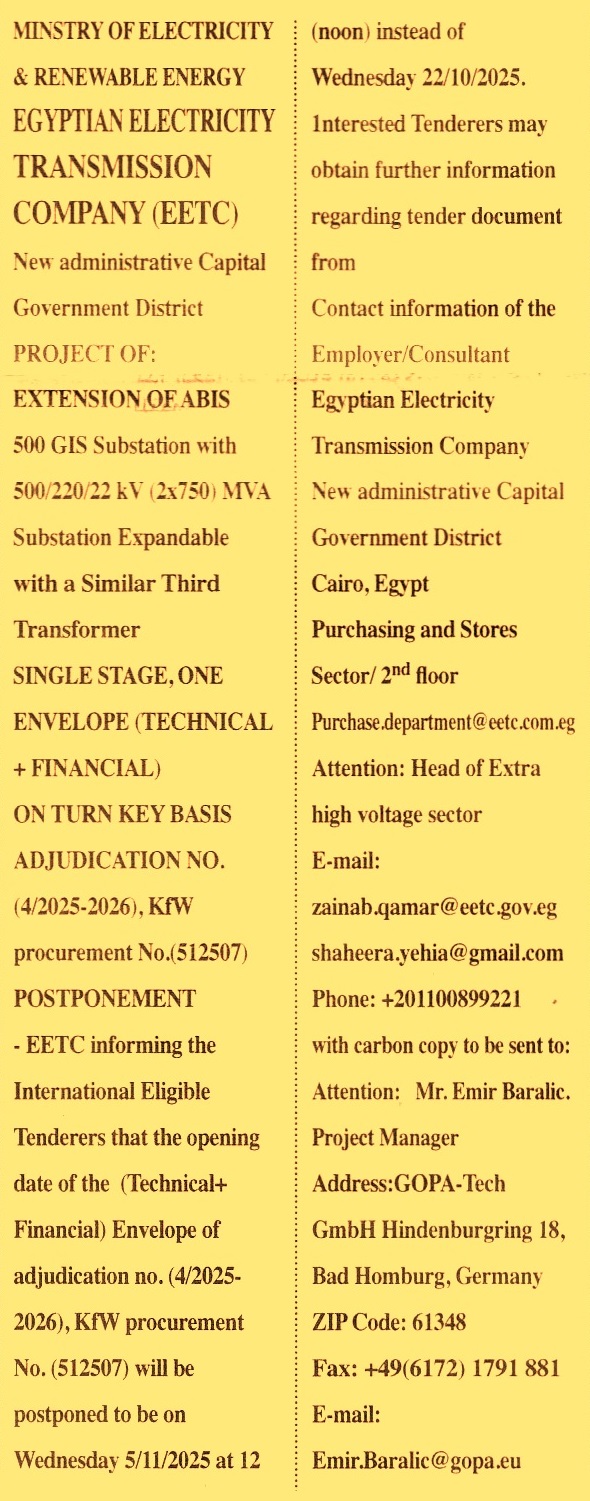 -EETC informing the International Eligible Tenderers that the opening date of the (Technical+Financial) Envelope