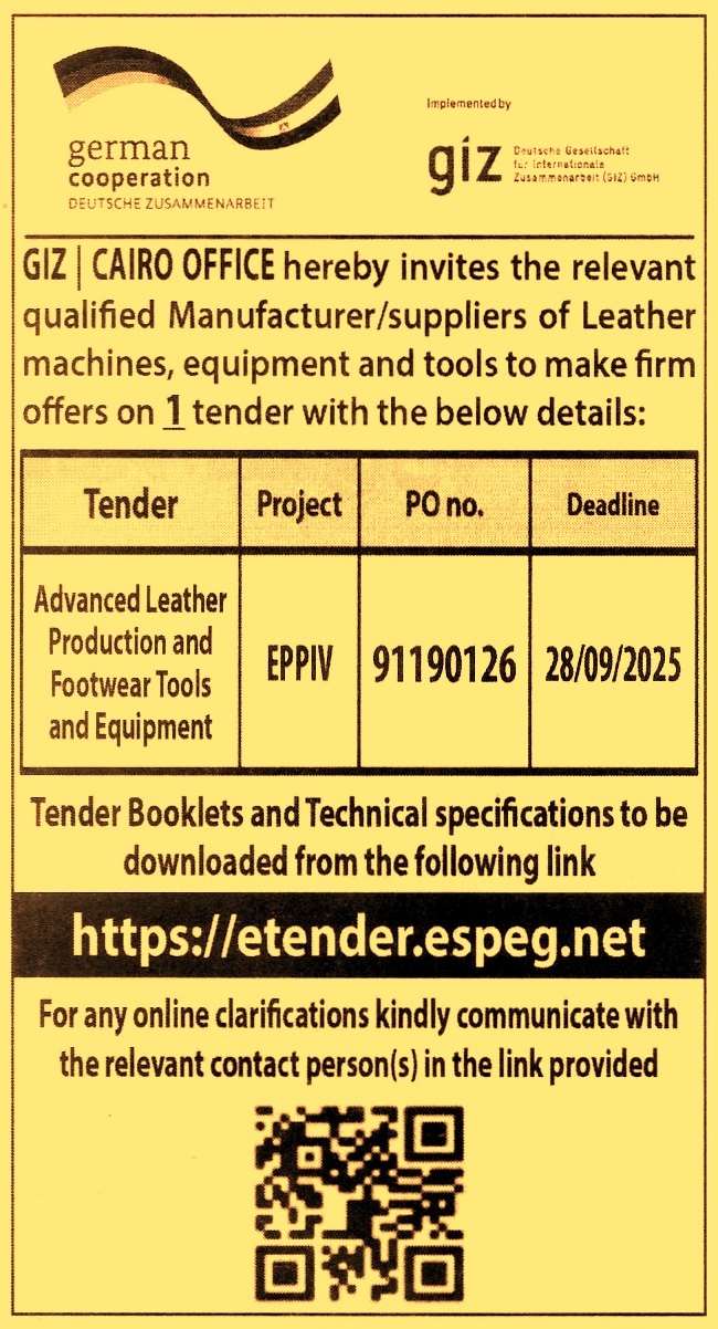 GIZ | Cairo Office hereby invites the relevant qualified Manufacturer/suppliers of Leather machines, equipment and tools