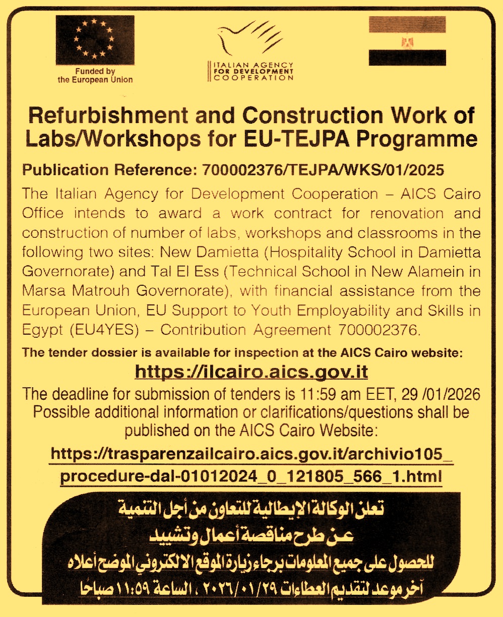 The Italian Agency for Development Cooperation – AICS Cairo Office intends to award a work contract