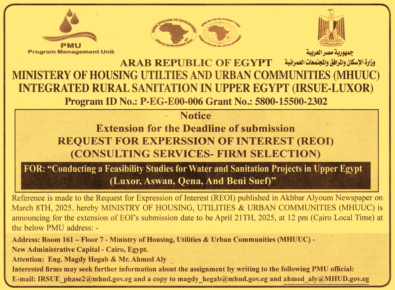 hereby MINISTRY OF HOUSING, UTILITIES & URBAN COMMUNITIES (MHUUC) is announcing for the extension of EOI’s submission date to be April 21st, 2025, at 12 pm (Cairo Local Time) at the below PMU address: –