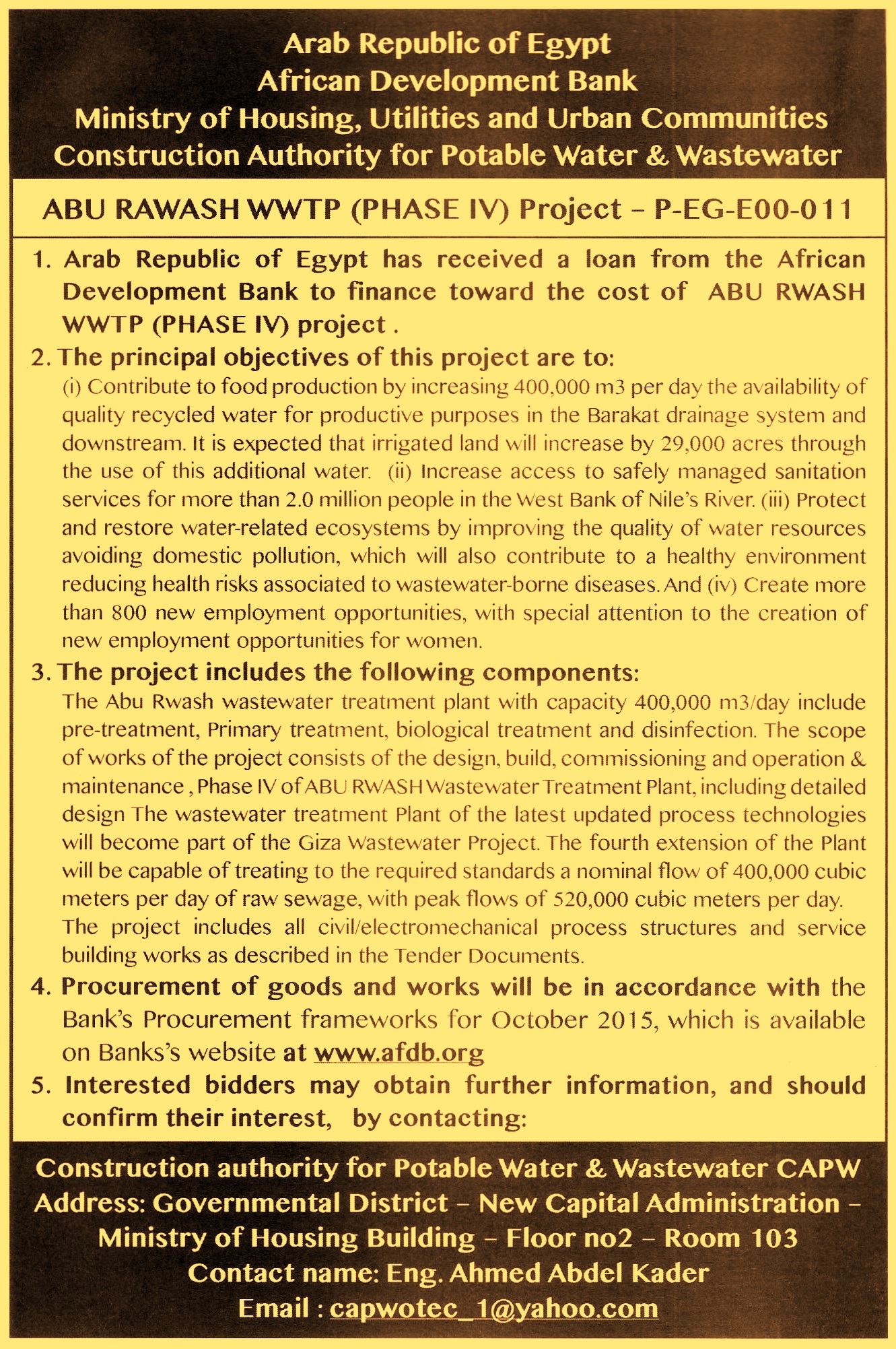 1- Arab Republic of Egypt has received a loan from the African Development Bank to finance toward the cost of ABU RWASH WWTP (PHASE IV) project.